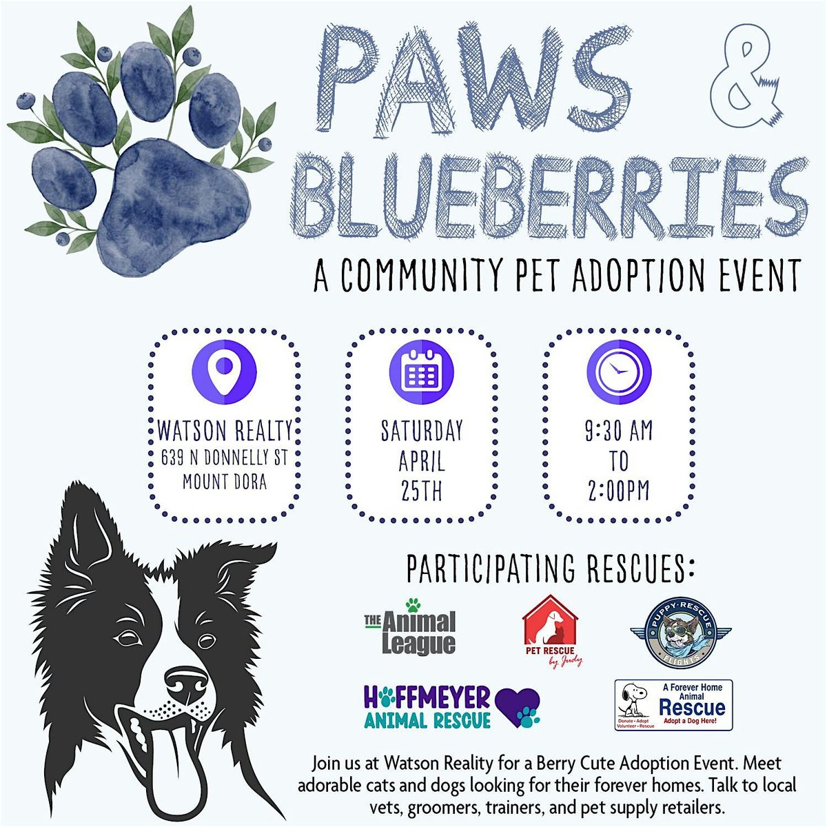 Join Watson Realty and DogTuff for the Paws & Blueberries Pet Adoption Event on Saturday, April 25, 2026, from 9:30 AM to 2:00 PM at Watson Realty in Mount Dora.