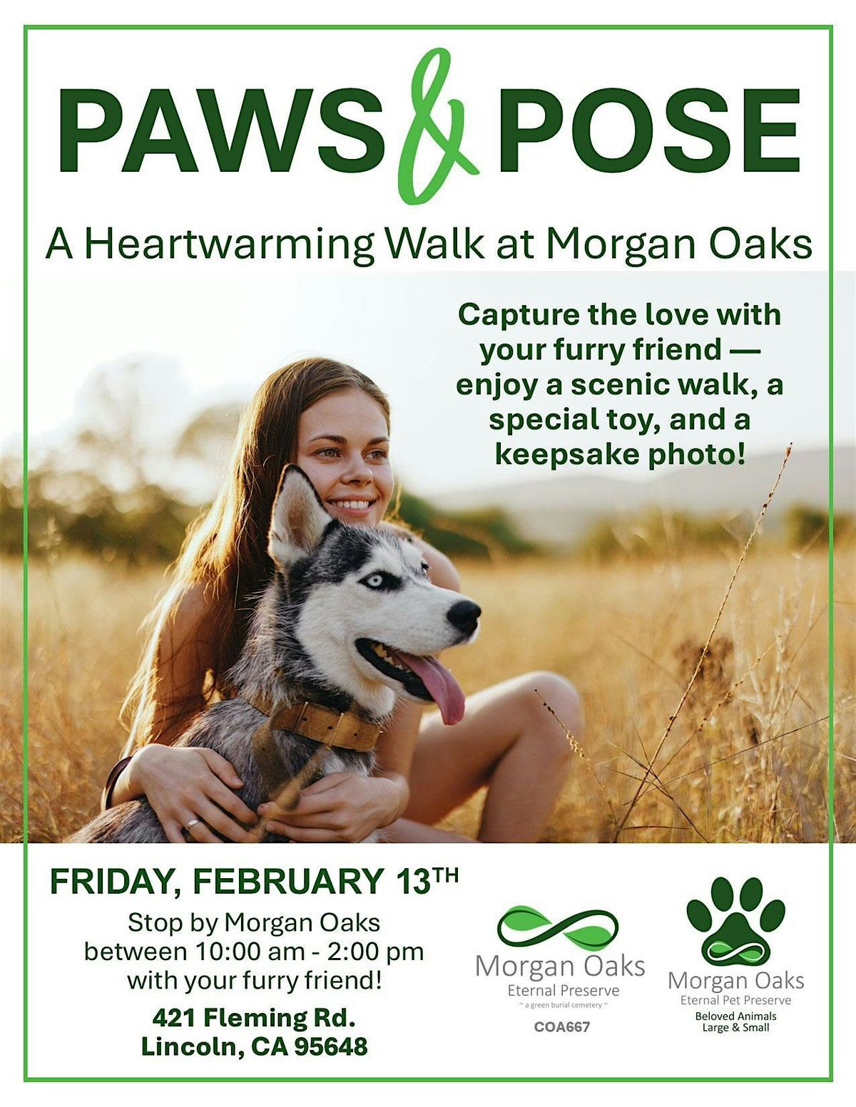Celebrate Valentineβs Day at our Paws and Pose event by bringing your dog for a free, festive photo session at Morgan Oaks! Your furry friends will receive a free bandana, treat, and toy while supplies last. Then, your adorable physical photo will be mailed to you afterward.