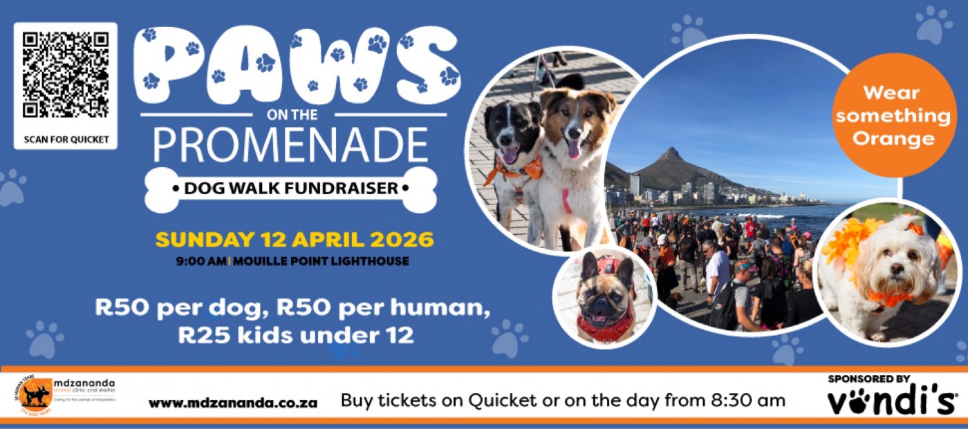 Humans and their four-legged besties — it’s time to hit the Sea Point Promenade for a tail-wagging good cause! Join us for Paws on the Promenade, a 5km dog walk fundraiser in support of Mdzananda Animal Clinic (Khayelitsha), in partnership with Vondi’s Holistic Pet Nutrition.