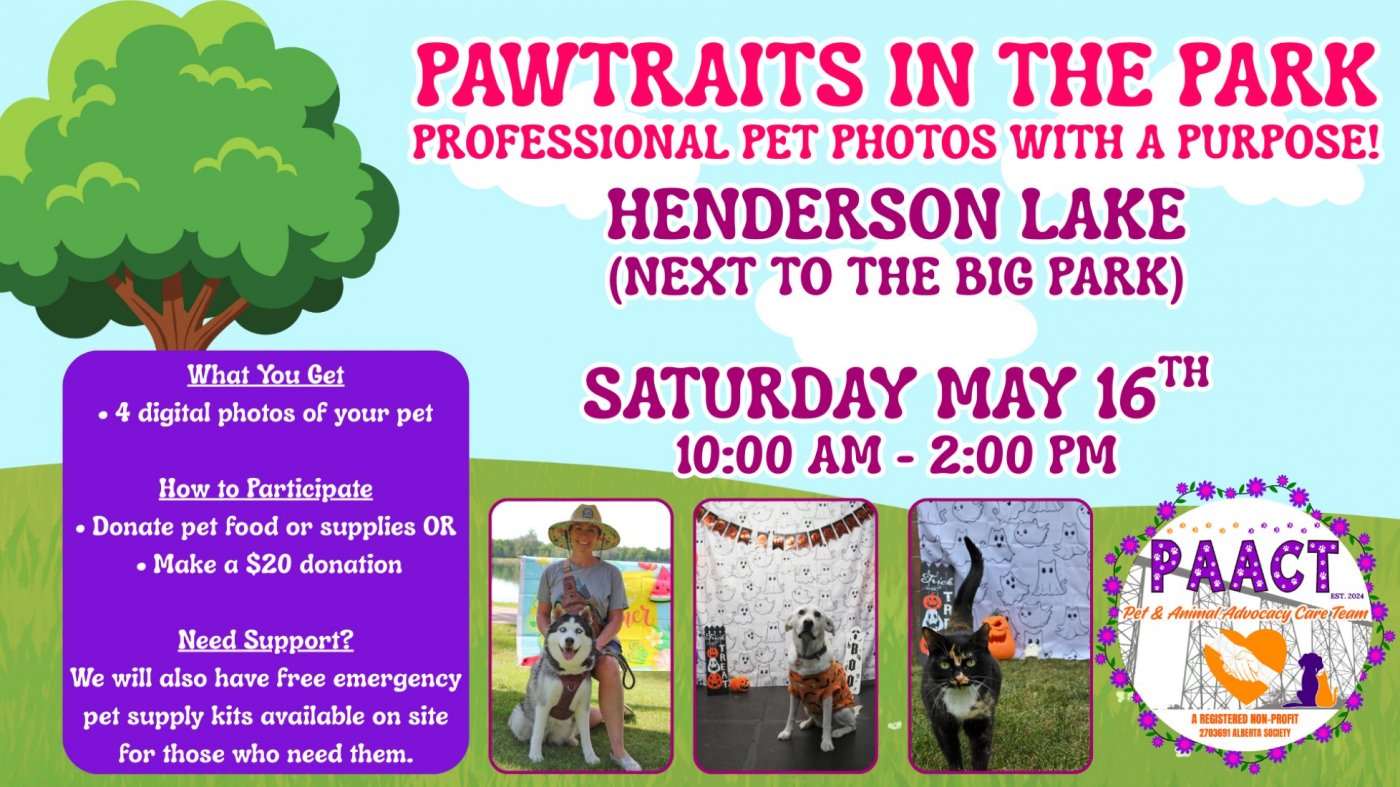 We are excited to bring something special to Pawtraits in the Park on Saturday, May 16th, from 10:00am to 2:00pm! Join us at Henderson Lake (near the main park area) in Lethbridge and treat your pet to a professional photo session—while giving back to pets in need.