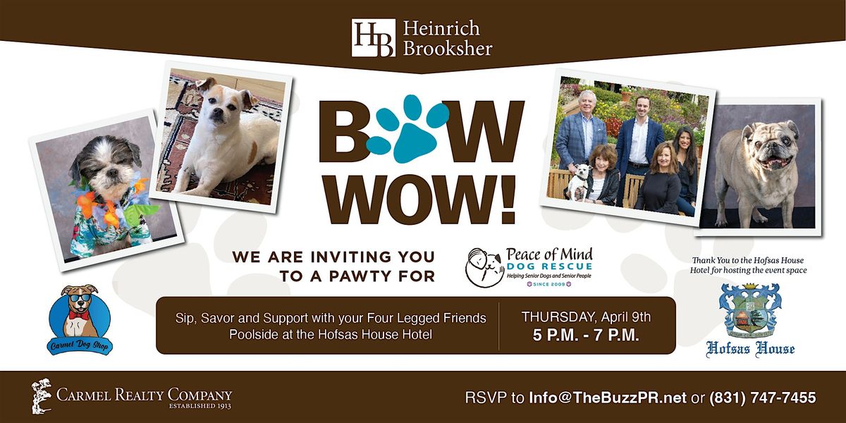 Join Heinrich Brooksher and Peace of Mind Dog Rescue for BOW WOW!, a heartwarming celebration held in honor of Puddin. This special evening invites you and your four-legged friends to sip, savor, and support senior dogs and senior people, all poolside at the Hofsas House Hotel.