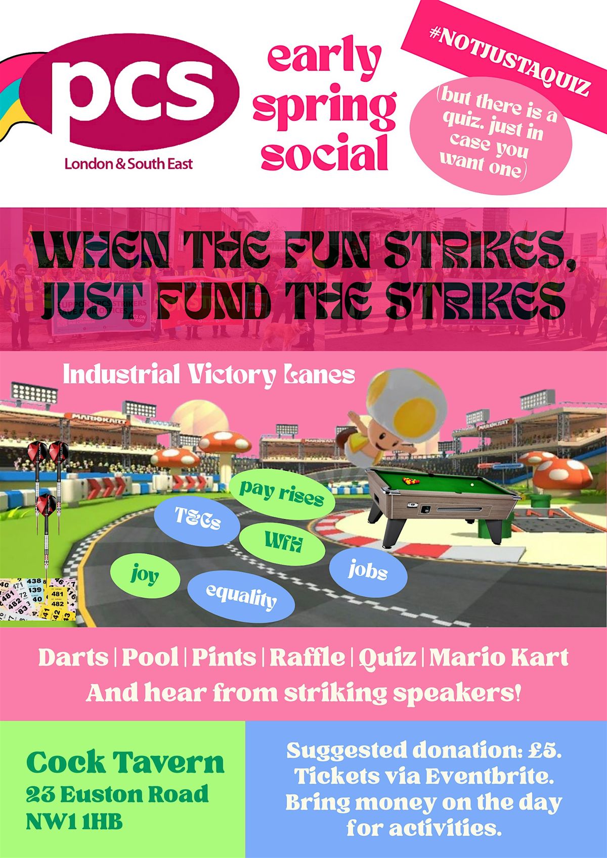 The PCS London & South East Regional Committee might be known for arranging its usual Christmas quizzes but we're making things a bit more interactive this year - with some darts, Mario Kart on an actual Switch, pool, a raffle and ...a paper quiz, because it wouldn't be a PCS L&SE social without some sort of quiz. And every penny will go towards the union's Fighting Fund to support the wide range of industrial action that's going on - and we've seen a range of disputes at the Tate, MOPAC and more, none of which would've been possible without the Strike Fund supporting our members to take action.