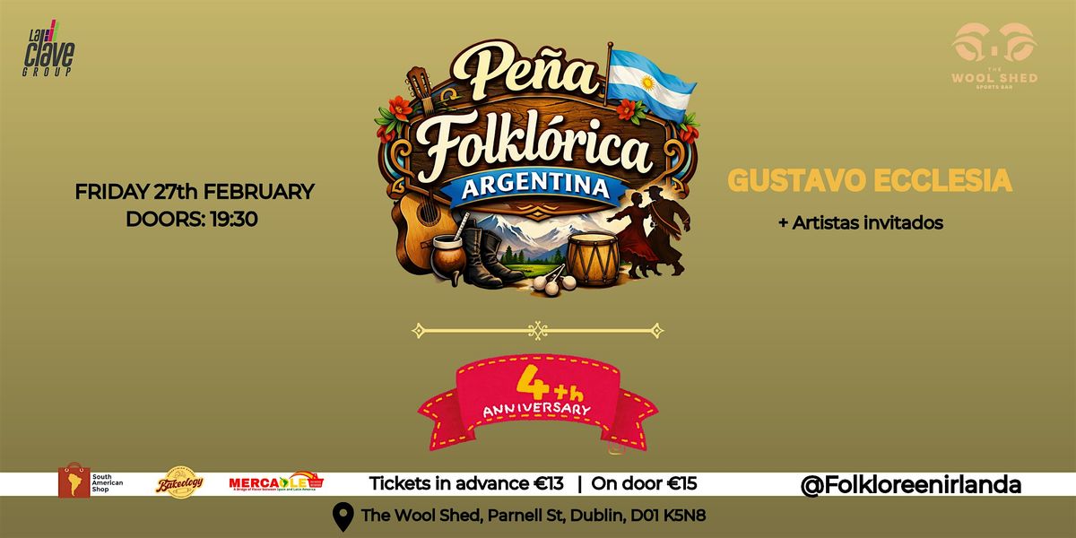 ¡Ven a disfrutar de una noche llena de música Argentina en vivo por parte de Gustavo Ecclesia e invitados en The Wool Shed! La Peña Folklórica es el lugar perfecto para disfrutar ya que hoy en día se formo como una familia.