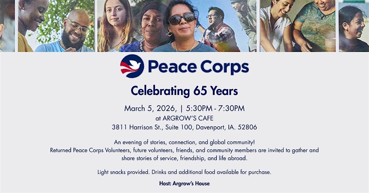 Join us at Argrow’s Café on March 5, 2026 from 5:30 PM to 7:30 PM for a special evening celebrating 65 years of Peace Corps service.
