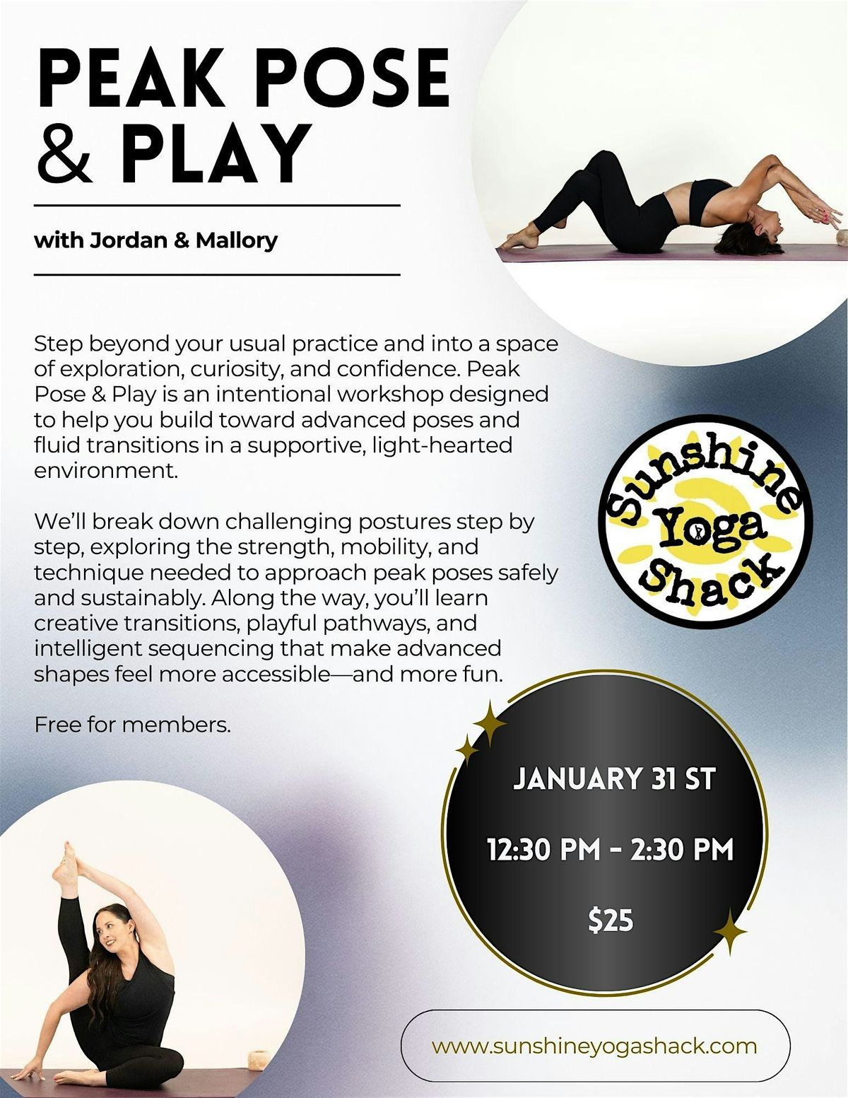 Step beyond your usual practice and into a space of exploration, curiosity, and confidence. Peak Pose & Play is an intentional workshop designed to help you build toward advanced poses and fluid transitions in a supportive, light-hearted environment.