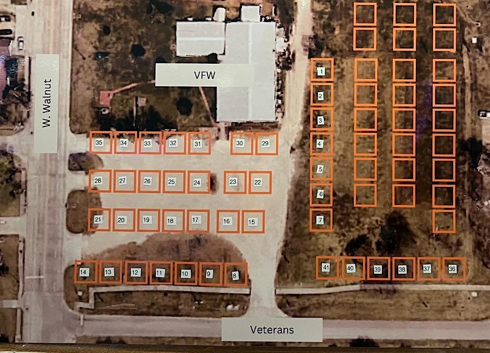 Spaces are 30x30 and you must be able to park your pit and all vehicles in that space. Extra vehicles may be parked in the parking lot behind the VFW or the Fire Department parking lot.
