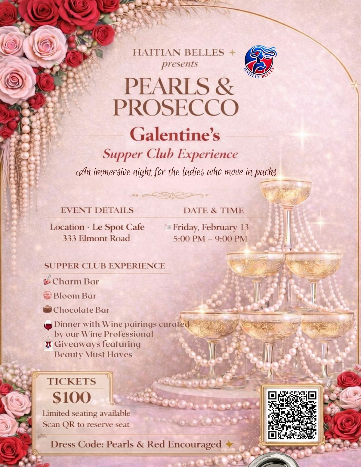 An elevated Galentine’s supper club with pearls, prosecco, wine pairings, curated indulgences, giveaways, and sisterhood-centered luxury.About this Event