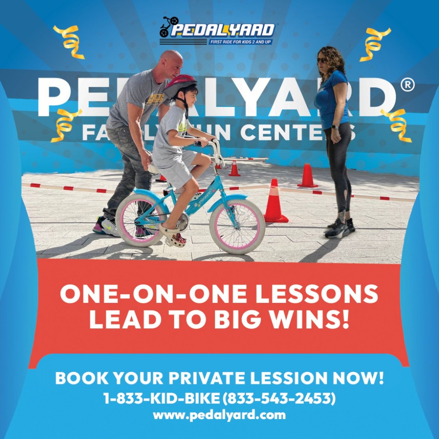 At PedalYard, our mission is powered by personalized one-on-one attention. We’ve started over 3000 kids and adults on their cycling journey. Our private lessons are safe, fun, and fast, and most riders learn to pedal confidently in less than an hour. We provide all the equipment and a safe place to learn. Call 1-833-KID-BIKE(543-2453) for more information and to make a reservation.
