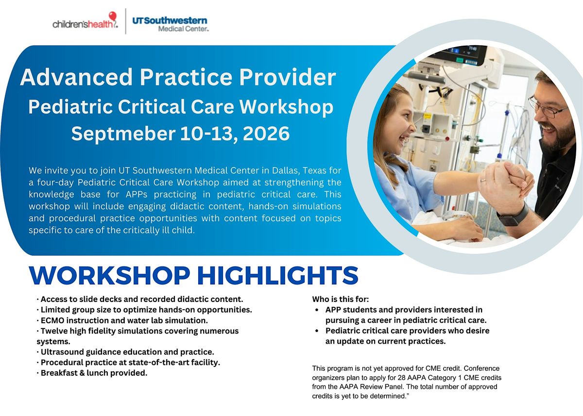 Join us for an exciting in-person event, the Pediatric Critical Care Workshop, hosted by UT Southwestern Medical Center! The Pediatric Critical Care APP Workshop is a three-day intensive learning experience designed to enhance the knowledge and skills of advanced practice providers (APPs) in the field of pediatric critical care. This comprehensive program combines didactic sessions with hands-on simulation exercises to provide a well-rounded learning experience. Whether you're a new grad student, current nurse practitioner or physician assistant interested in this specialized area, this workshop is perfect for you!