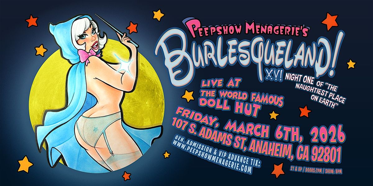 Peepshow Menagerie, L.A.'s longest running burlesque show, returns to The Doll Hut stage with the first night of their THREE Night 16th annual burlesque parody of 'THAT' theme park featuring many of L.A.'s top performers performing burlesque interpretations of some of their favorite 'Dizney' movies and theme park attractions! See performances based on some of your favorite rides and films for a night of tease, dance, and comedy!