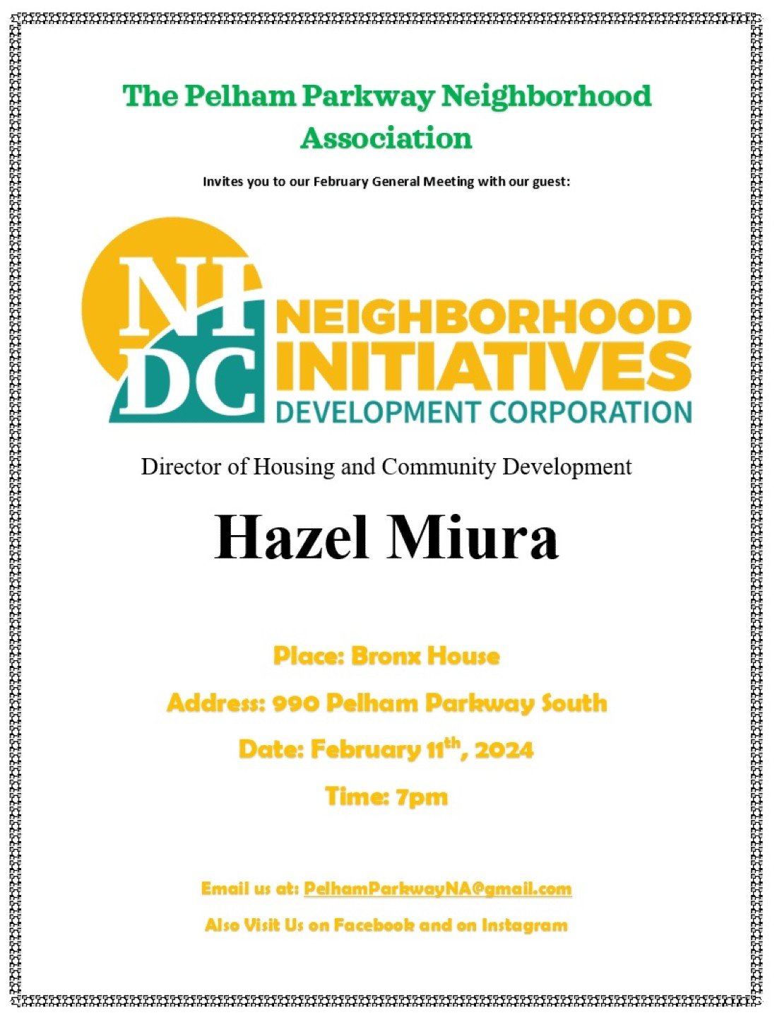 event at Bronx House. First will be The NYC Mayor's Public Engagement Unit and the featured speaker will be Ms Hazel Muira Director of Housing and Community Development from NIDC (Neighborhood Initiatives Development Corp). We meet at Bronx House located at 990 Pelham Parkway South. Bx NY 10461.We start at 7:00 pm. Please join us for this information gathering event to hear what our two guest speakers have to say. Look foward to seeing all of you.