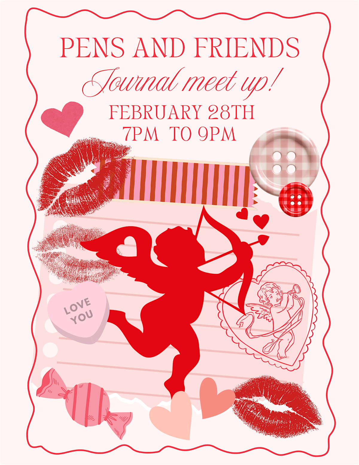 Love shouldn't end on the 14th! Grab a friend or make one at the Pens and Friends Galentine's Day meet up on the 28th of February at Nueces Brewing and BBQ. Bring all your Valentine's day scraps and February ephemera to make a journal spread about the ones you love and or the things you love. Newcomers will get a free goodie bag filled with things to help you get started with your spread. We encourage people to bring any extra journaling material that they have and are willing to share with the group.