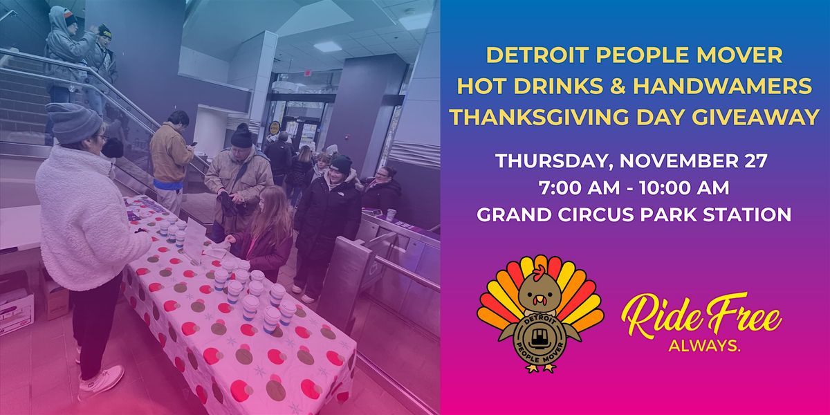 On Thanksgiving Day, the People Mover operates from 6:00 a.m. to 7:00 p.m. and will be a hub of activity, starting with the free "Hot Cocoa and Handwarmers" event at Grand Circus Park Station from 7:00 a.m. to 10:00 a.m. Everyone is welcome to stop in for the giveaways during the Turkey Trot or while America’s Thanksgiving parade travels down Woodward Avenue.