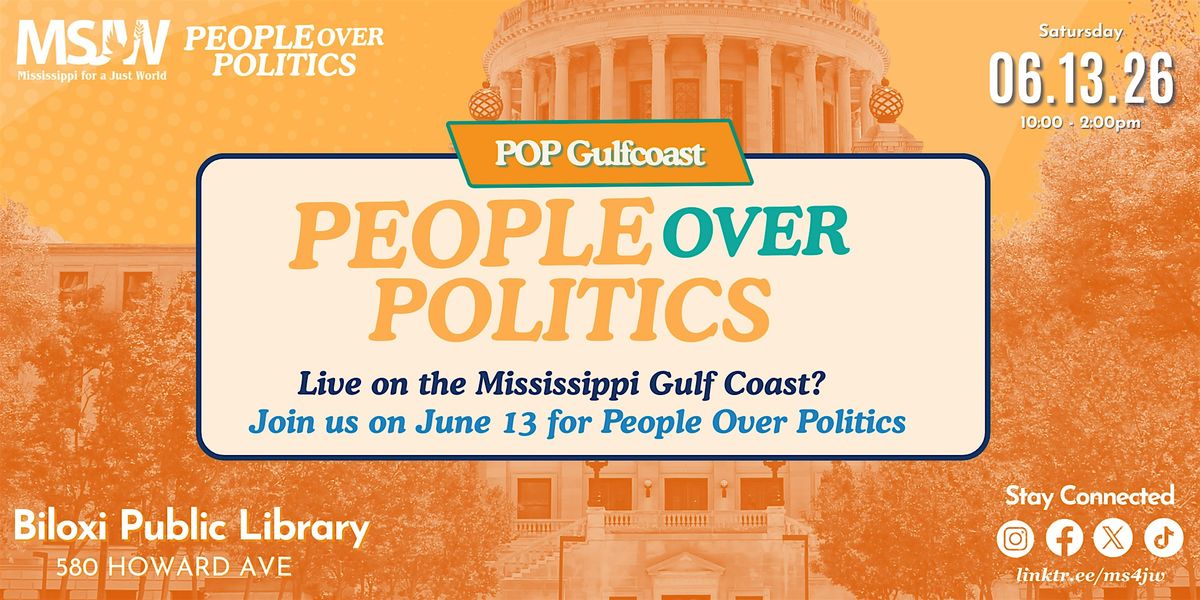 Join Mississippi for a Just World (MSJW) for our first People Over Politics (POP) on the Mississippi Gulf Coast! This program is a free, comprehensive legislative advocacy workshop designed to empower everyday Mississippians to make a change in their state.