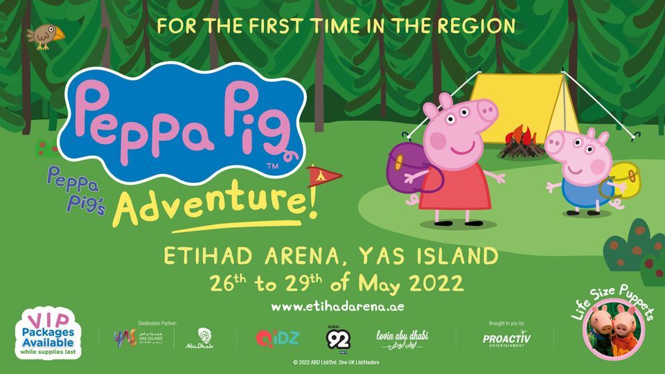 Peppa Pig’s Adventure comes to the region for the first time, join Peppa and her world in their live show in and fun-filled occasion for the whole family.Peppa is about to embark on an exciting camping trip in the woods with George and her school friends including Pedro pony, Suzy Sheep and Gerald Giraffe. With lunchboxes packed and Daddy Pig driving the bus, Peppa and friends are excited about their outdoor adventure full of singing, dancing, games and surprises.
