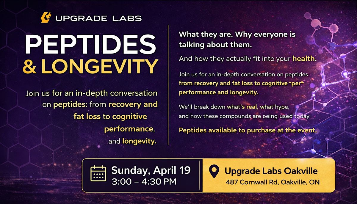 Join us at Upgrade Labs Oakville for a clear, no-BS breakdown of peptides: what’s real, what’s hype, and how they’re actually being used in the world of performance and longevity today.