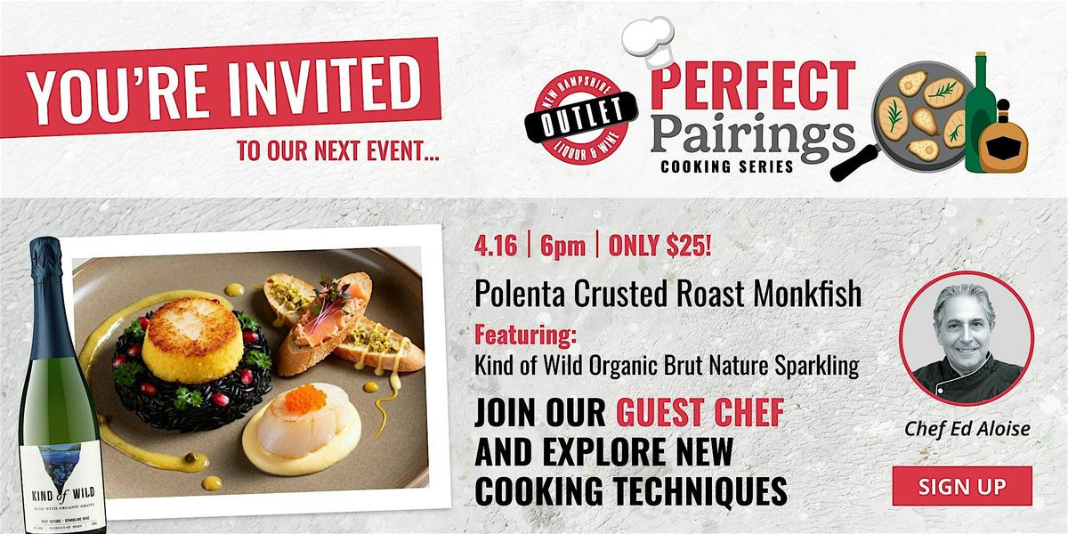 This April, Chef Ed Aloise returns with a stunning three-course menu inspired by the ocean — from a delicate scallop mousse and smoked salmon pâté to a show-stopping polenta-crusted monkfish medallion served over jeweled forbidden rice with a bold red pepper coulis. Each course is thoughtfully paired with Kind of Wild's lineup of certified organic, zero-sugar wines, from a crisp Brut Nature Sparkling to a rich Cabernet Sauvignon.
