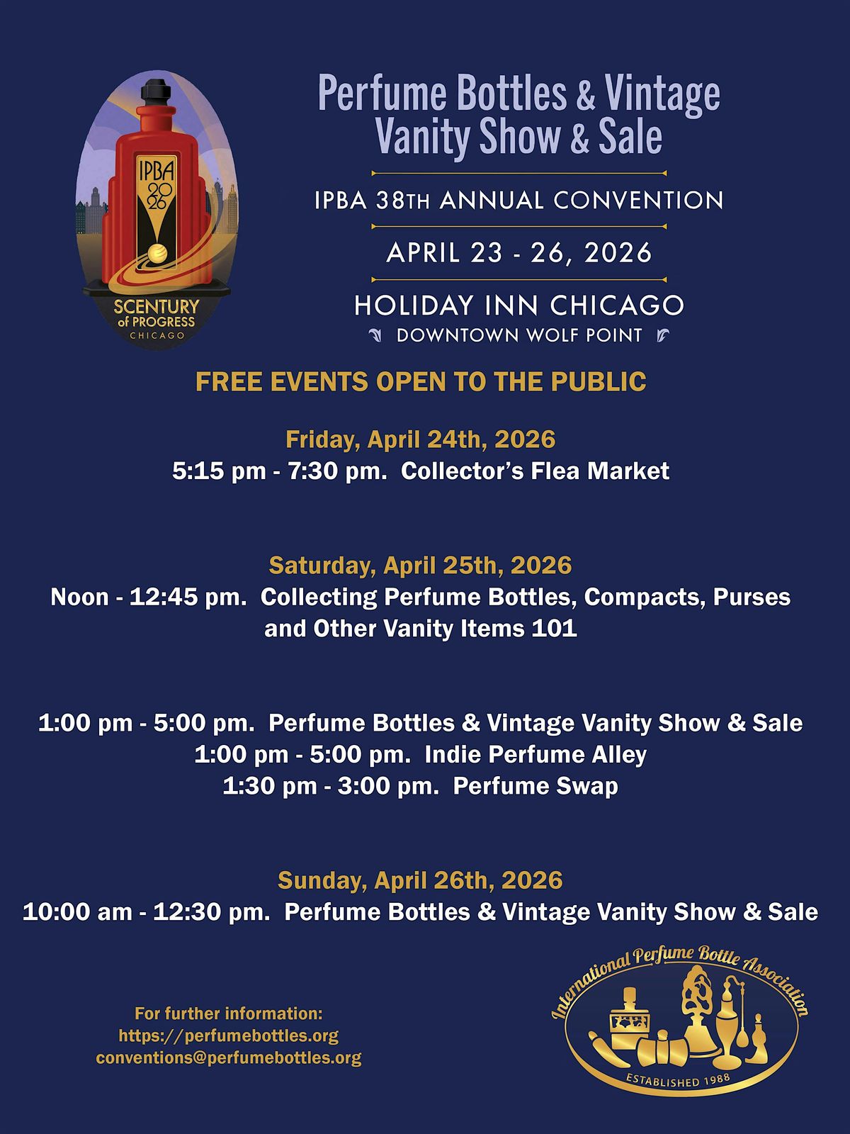 Come join us in person for 3 fun days filled with unique perfume bottles and charming vintage vanity pieces! Whether you're a collector or love perfume, this event is the perfect chance to find some hidden gems and chat with fellow enthusiasts. Don't miss out on this unique show & sale – see you there! And be sure to discover the Indie perfume alley & swap on Saturday!