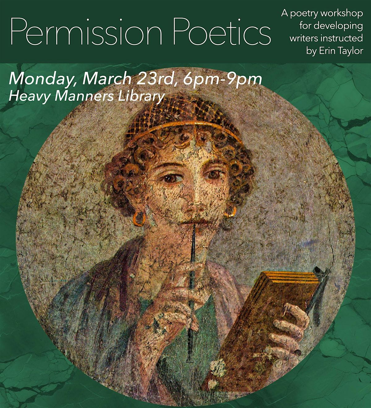 The workshop is a unique pedagogical approach to giving oneself permission in finding poetic voice and building confidence in performance of your writing. The workshop will be instructed by poet, journalist, and screenwriter Erin Taylor.