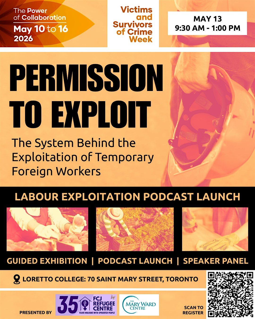 FCJ Refugee Centre, in partnership with Mary Ward Centre, are proud to present an immersive half-day experience for the national Victims of Crime Week, exploring the realities of labour exploitation spectrum in Canada. Through a guided exhibition touching on the realities of labour exploitation, and a launch of FCJ Refugee Centre’s podcast series, Permission to Exploit, we will explore stories drawn from lived experiences, as participants will move through the various stages, from recruitment to exploitation. The event will also feature a short panel with workers, advocates, and experts, to invite reflection, dialogue, and action. Refreshments, including tea and coffee and some light snacks, will be provided at the event.
