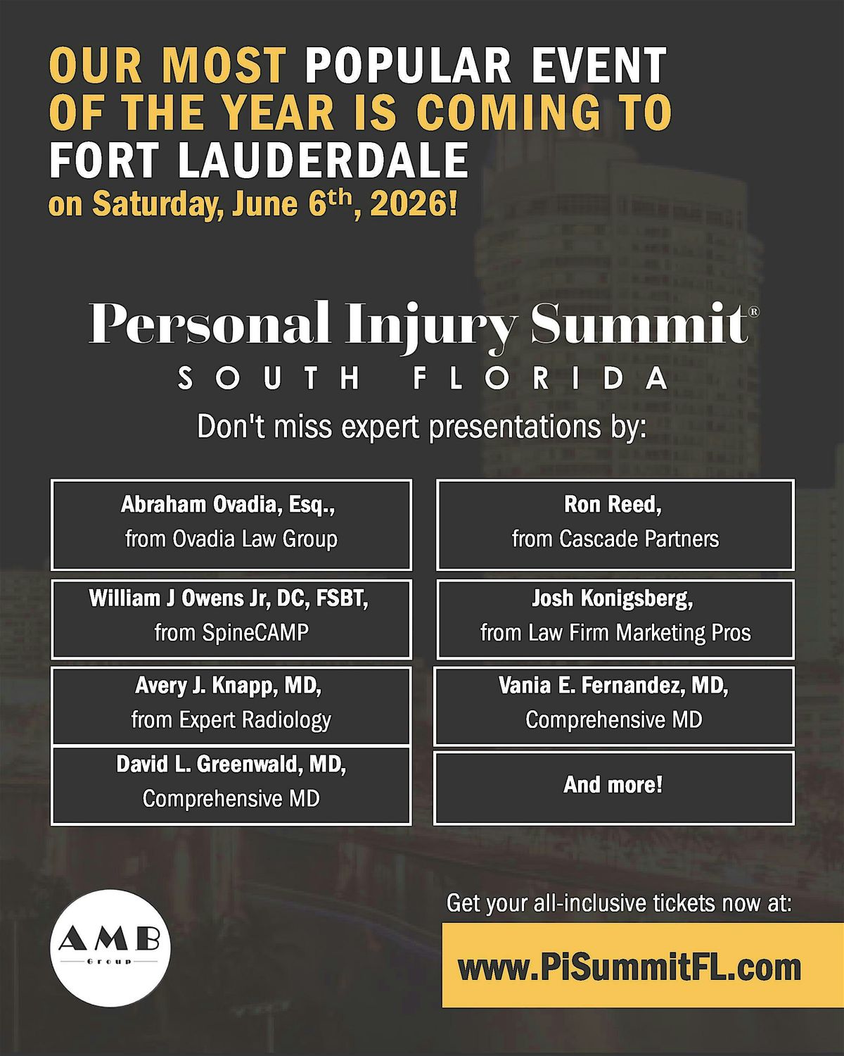 Welcome to the Personal Injury Summit in FT. LAUDERDALE, FL! Join us at Tower Club Fort Lauderdale on June 6, 2026 at 8:00 AM (EST) for a day filled with insightful discussions and networking opportunities. Whether you're a legal professional, healthcare provider, or simply interested in personal injury cases, this event is perfect for you. Don't miss out on this chance to learn from industry experts and connect with like-minded individuals. See you there! For sponsorships, discounted tickets or ticket packages for your team, please go directly to our website www.PiSummitFL.com