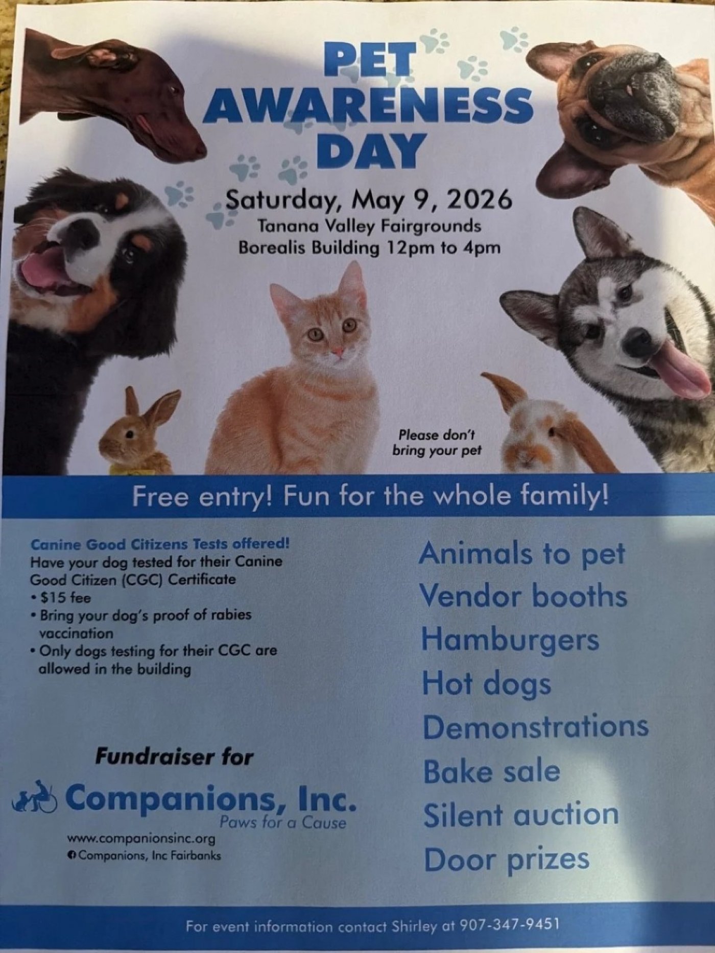 Join us for our annual Pet Awareness Day fundraising event for Companions, Inc. Enjoy lots of animals to pet, a bake sale, Smooch the Pooch kissing booth, lots of vendors, grilled hamburgers and hotdogs and an amazing silent auction. This is a family event FREE to the public.