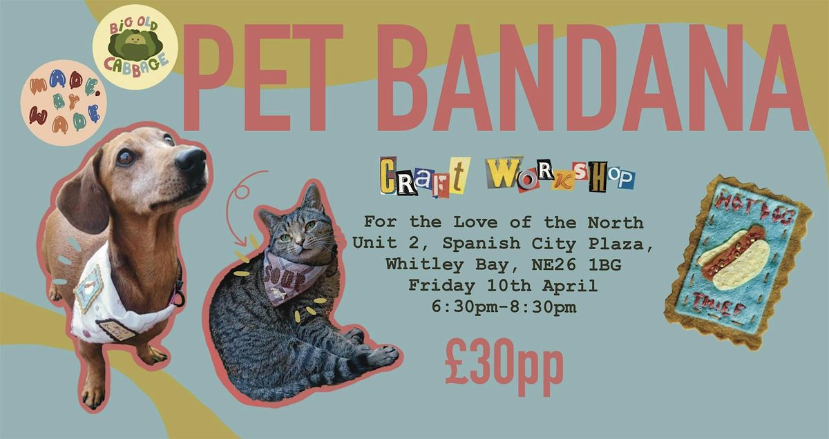 Grab your ticket to our adults only beginner friendly craft workshop to make a pet bandana for your furry friend. £30pp. 6:30pm-8:30pm. All materials and tools will be provided, but you can absolutely bring your own special bits of fabric/ buttons/ beads if you wished! Guided by craft experts Wade and Kate, you will leave this workshop with a one of a kind bandana for your pet!