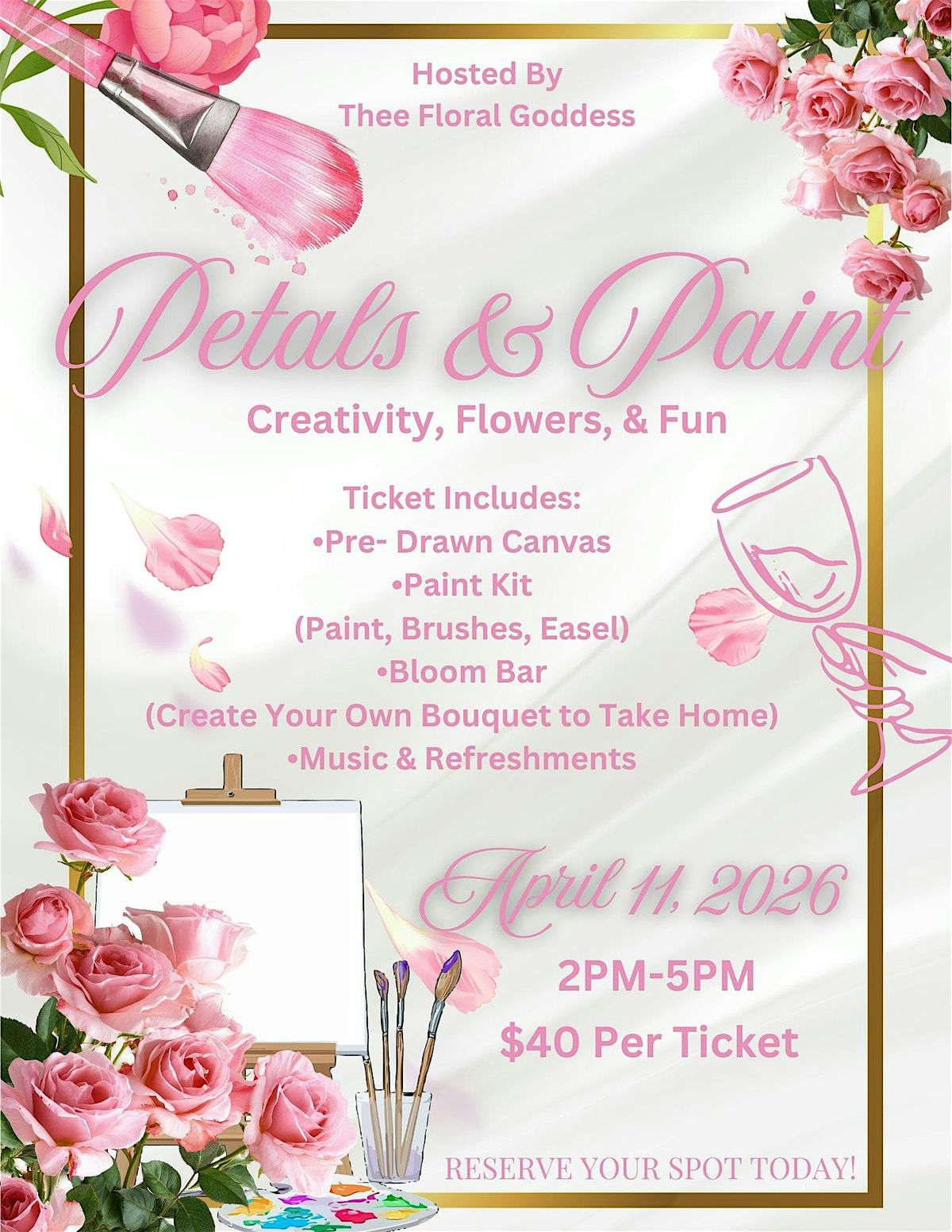 Join us for a beautiful afternoon of creativity, flowers, and good vibes! Your ticket includes a pre-drawn canvas, full paint kit (paint, brushes, and easel), and access to our Bloom Bar where you can create your own bouquet to take home. Enjoy music, refreshments, and a relaxing atmosphere while you paint and design something special. Perfect for a girls’ day out or a fun creative experience! 💐