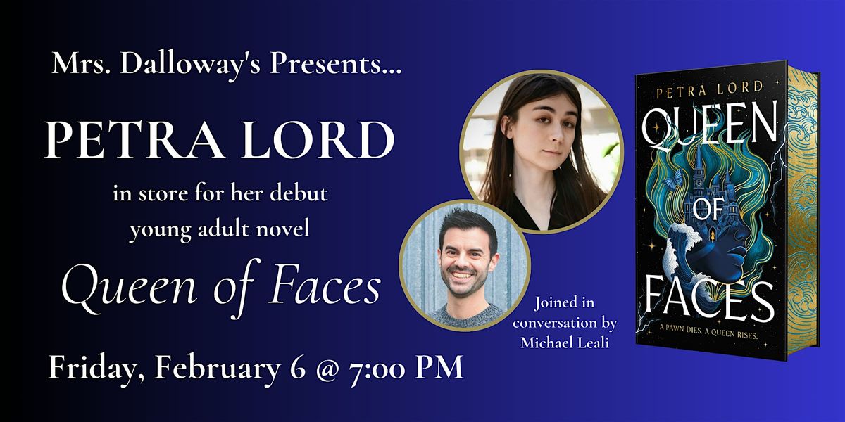 Join us at Mrs. Dalloway's Bookstore on Friday, February 6 when debut author Petra Lord comes to the store to present her debut young adult fantasy novel for teens Queen of Faces. Petra will be joined in conversation by Michael Leali and will sign copies of her book after the presentation.