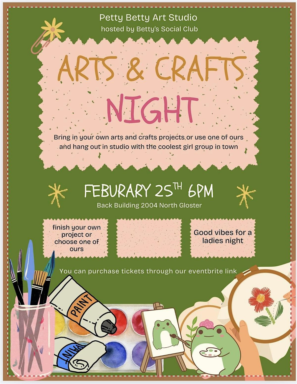 Welcome to Petty Betty’s Arts & Crafts Night at Petty Betty Art Studio! Join us on February 25, 2026 at 6:00 PM for a fun-filled evening of creativity and laughter.