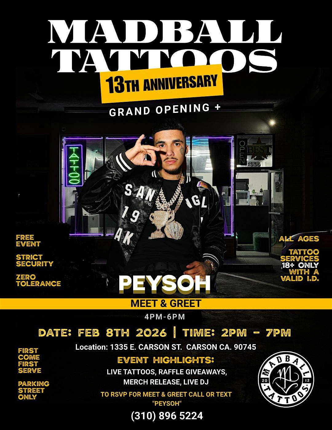 Come celebrate the 13th anniversary of Madball Tattoos with a special appearance by Peysoh! Join us at Madball Tattoos on February 8, 2026 at 2:00 PM. Get ready for a day filled with incredible art, music, and good vibes. Don't miss out on this epic event!