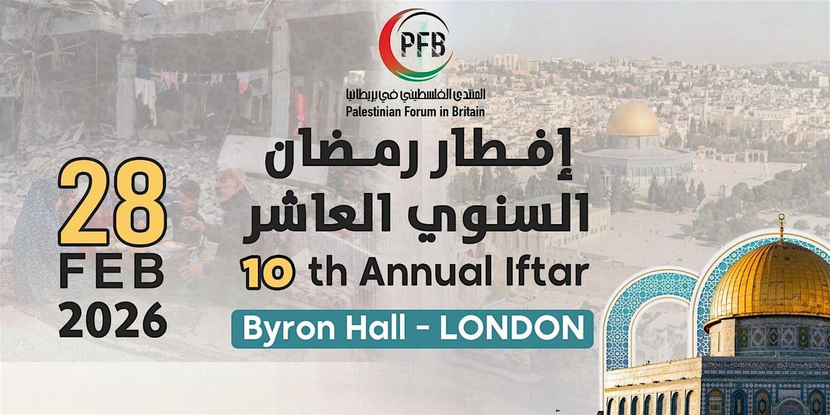 The Palestinian Forum in Britain is pleased to invite you to the 10th Annual Iftar, which will take place on Saturday, 28 February 2026, at Byron Hall – Harrow, West London. Join us for a Ramadan evening of solidarity with Gaza and the West Bank, bringing together the Palestinian and Arab community, as well as their friends in Britain, with over 1,000 participants expected.