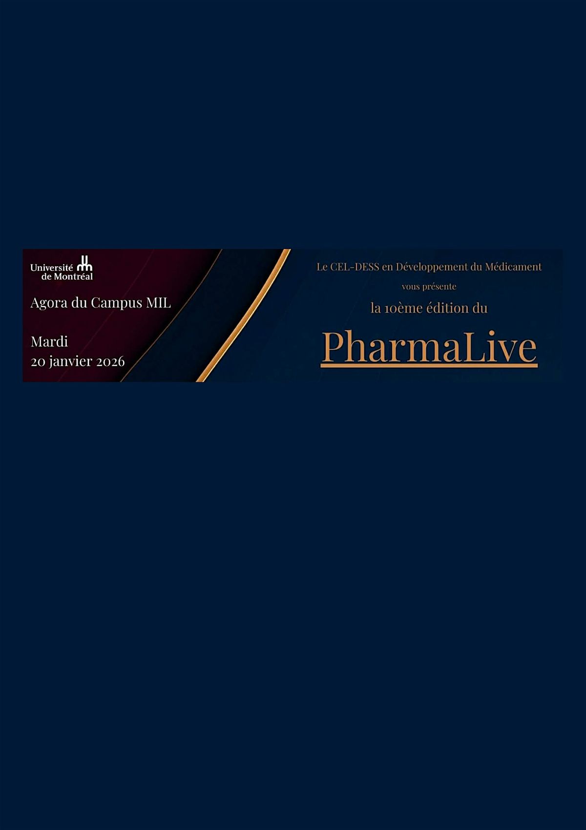 Le PharmaLive vise à rassembler des professionnels du milieu pharmaceutique et des professeurs académiques afin d'initier les finissants du D.É.S.S en Développement du Médicament ainsi que les étudiants en Sciences Pharmaceutiques de l'Université de Montréal aux différentes avenues de carrière. Cet événement facilite la formation d'un réseau professionnel qui orientera les finissants dans leurs choix de carrière. Il offre également une opportunité précieuse à l'industrie pharmaceutique en perpétuelle expansion et évolution, lui permettant d'accéder à une ressource humaine de qualité, brillante, ambitieuse et innovante.