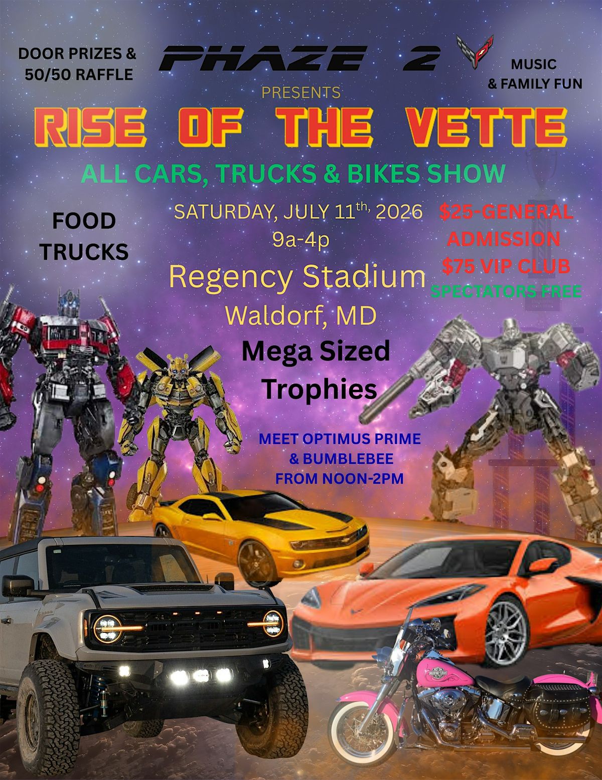 Welcome gearheads and car enthusiasts! The Phaze 2 Corvette Club is thrilled to present Rise of the Vette - All cars, trucks & bikes show on July 11, 2026 from 9a-4p. Join us at Regency Furniture Stadium @ 11765 St Linus Drive in Waldorf, MD for a day filled with roaring engines, shiny chrome, and a shared love for all things automotive. Whether you're a Corvette aficionado, a truck lover, or a bike enthusiast, this event is for you! Don't miss out on the opportunity to connect with fellow car lovers and admire some stunning vehicles. Bring the kids for pics with Optimus Prime & Bumblee from noon until 2p. There will be music, food trucks and MEGA sized trophies! See you there! Rain Date: Sunday, July 12th, 2026.