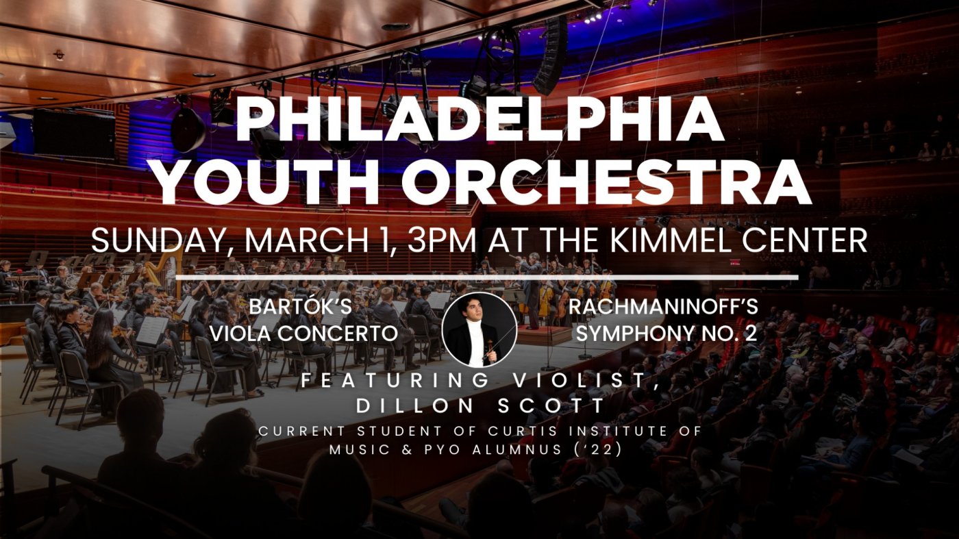 Violist Dillon Scott, PYO ’22 & current student of Curtis Institute of Music, returns as soloist for Bartók’s expressive Viola Concerto. The program concludes with Rachmaninoff’s Second Symphony, celebrated for its sweeping melodies and emotional depth.