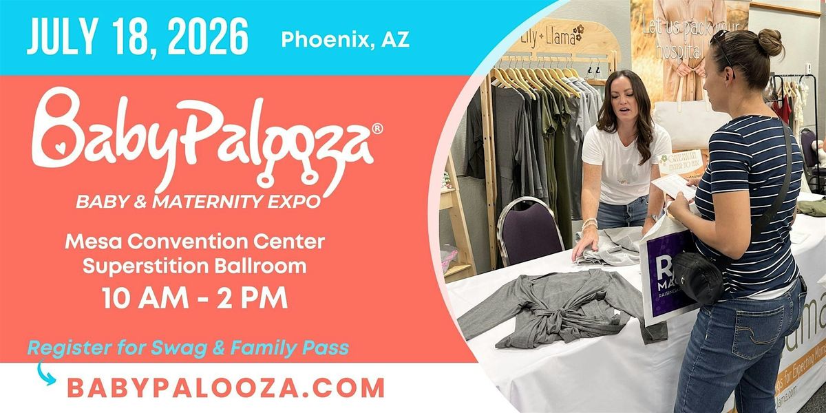 Calling all new moms and expecting moms in the Phoenix area. Join us at the Phoenix Babypalooza Baby Expo on Saturday, July 18, 2026, from 10 AM to 2 PM at the Mesa Convention Center!