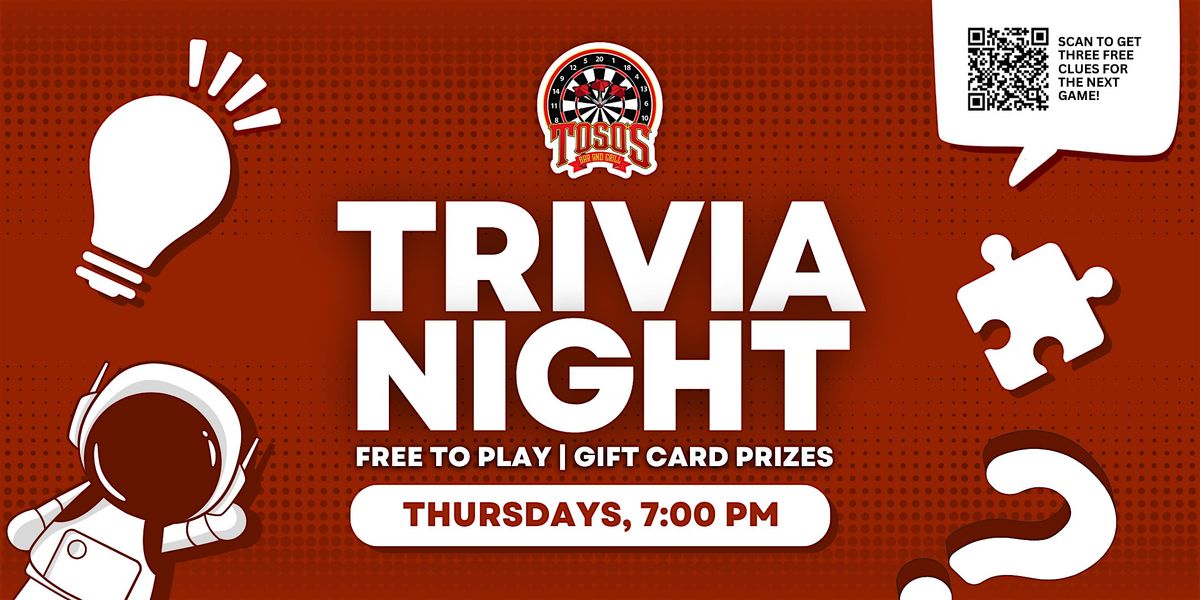 Join us for free live trivia every Thursday at 7pm at Toso's Sports Bar & Grill in Phoenix! Free to play, and top teams win gift card prizes!