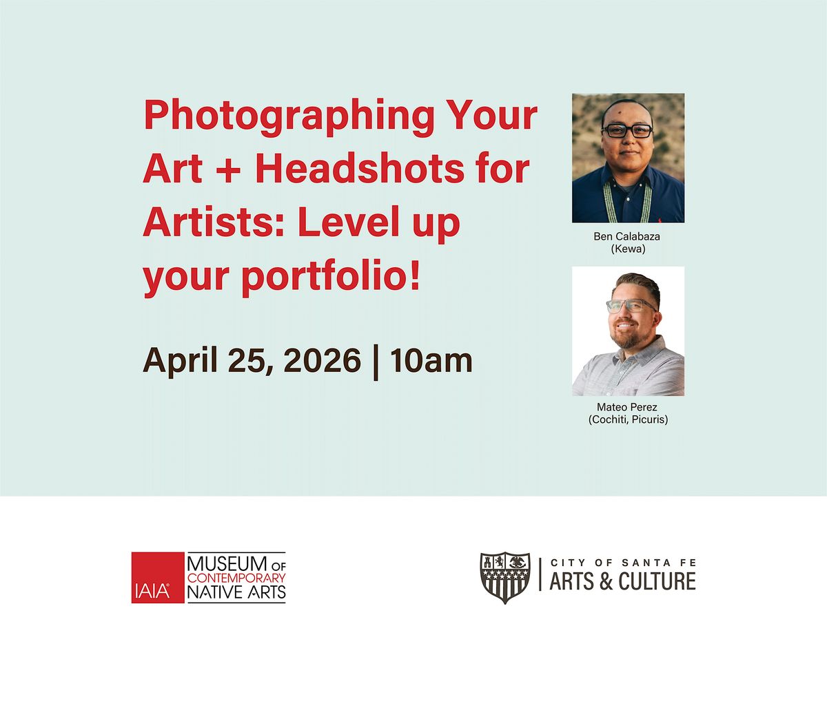 Join photographers and design specialists Ben Calabaza (Kewa) and Mateo Perez (Cochiti, Picuris) for a hands-on workshop on photographing your artwork and professional headshots.