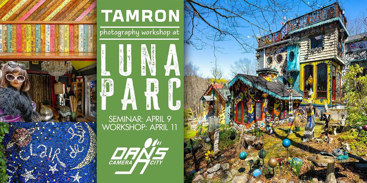 Join us for an exciting 2-part workshop at Luna Parc Atelier led by Field Service Manager and professional photographer, Ken Hubbard and Patty Gregitis of Tamron Sales Division. The event will begin Thursday, April 9, with an informative seminar covering useful photography tips and techniques that will benefit you on capturing great images at Luna Parc, as well as cover the guidelines of the semi-private museum, atelier, and private home of 21st century American multimedia artist Ricky Boscarino. On Saturday, April 11, we will take a chartered bus to Luna Parc and walk the grounds capturing unique and beautiful photos with the help from Tamron and staff of Dan's Camera City. Free Tamron lens loaners will be available for use throughout the event.