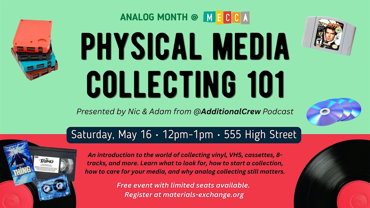 Curious about collecting vinyl, VHS, cassette tapes, 8 tracks, and more? Join Nic and Adam from the Additional Crew Podcast on Saturday, May 16 from 12 PM to 1 PM at MECCA, 555 High Street for an introduction to the world of physical media collecting.