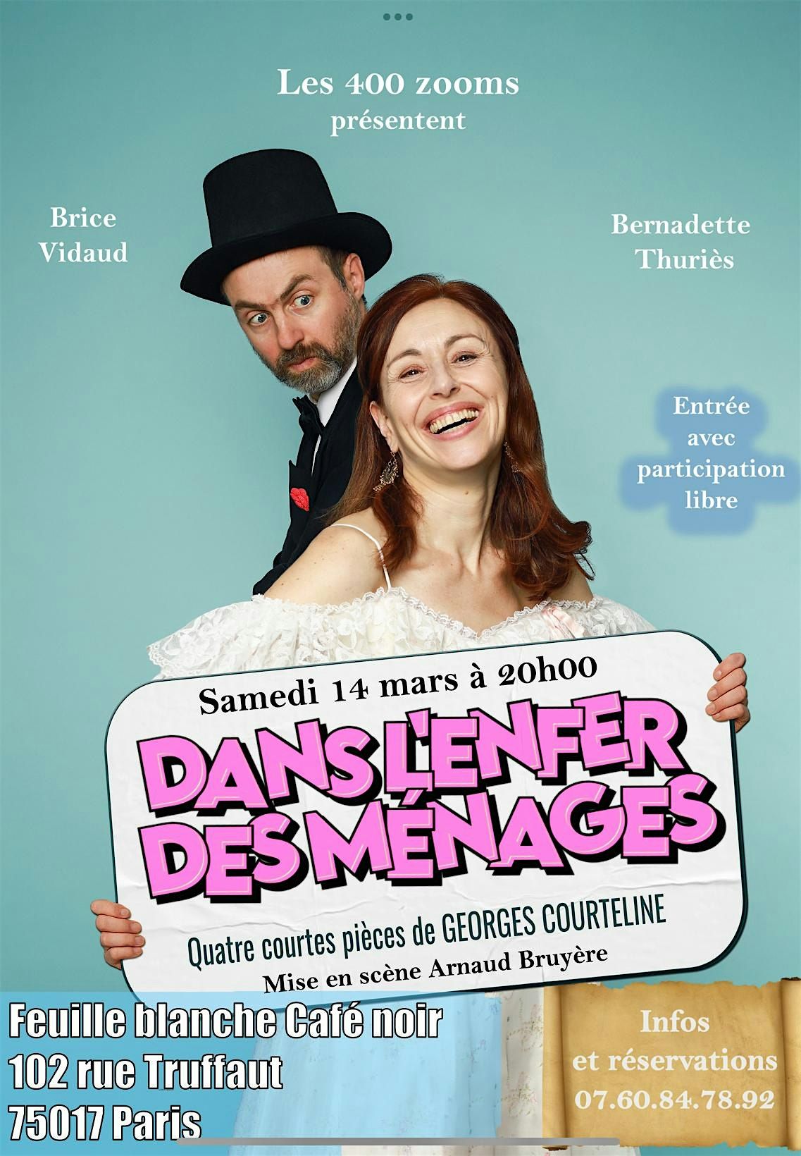 Avec des portraits aussi acides que décapants, dressés à l’aide d’une écriture à l’humour corrosif et d’une finesse psychologique sans pareille, Courteline, au travers de ces quatre saynètes, nous propose un véritable voyage : une plongée brute dans l’enfer des ménages.