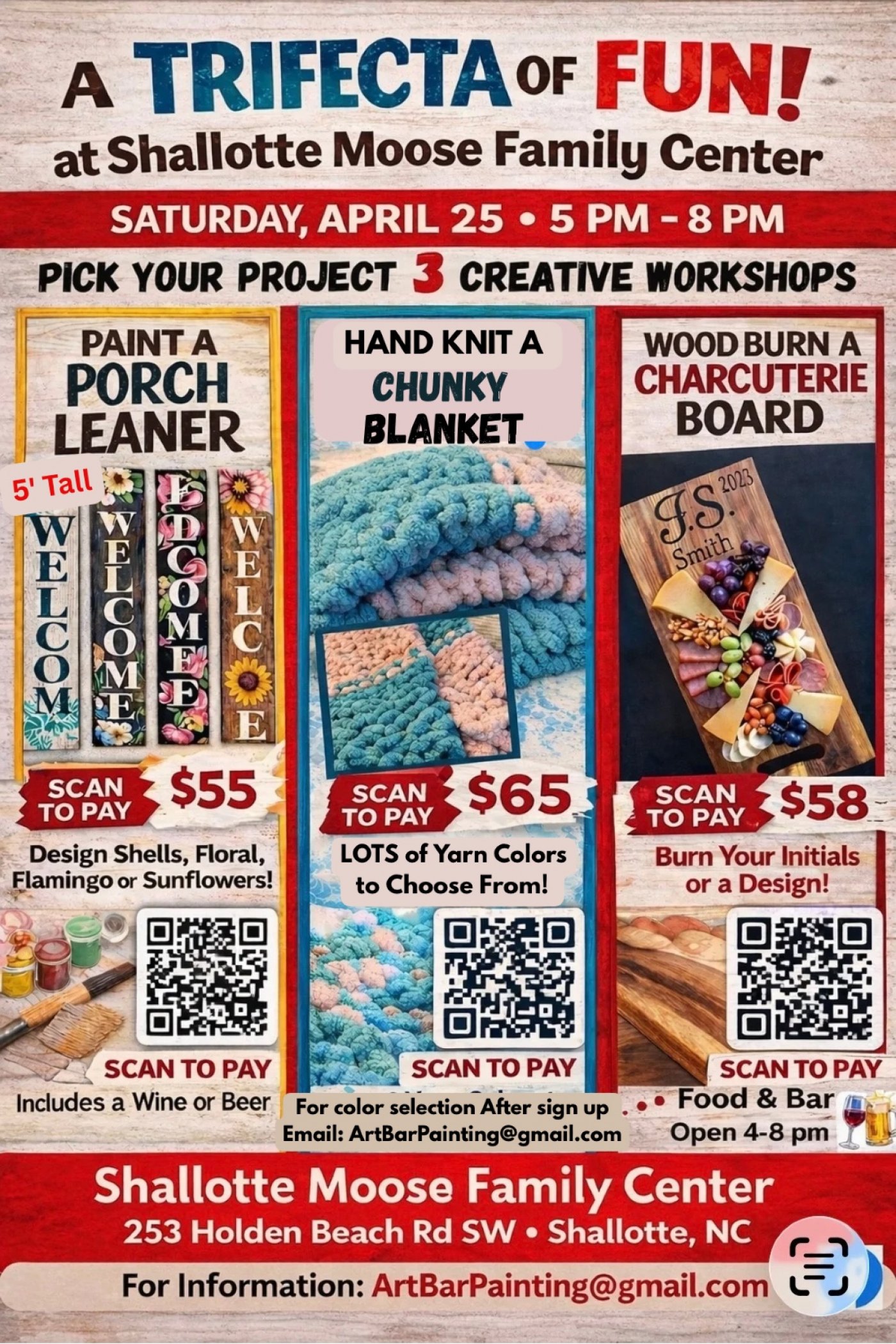 Hand knit a chunky blanket, Woodburn, a charcuterie board or paint a porch cleaner all workshops include a wine or beer.