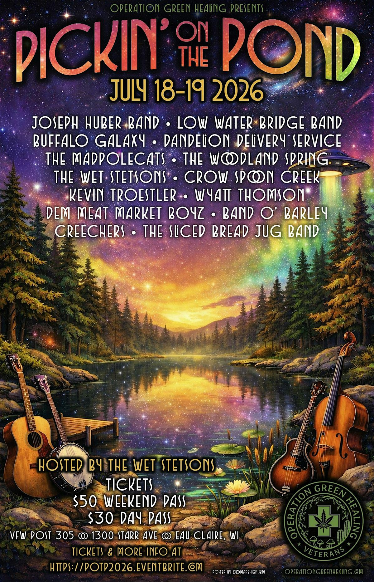 Pickin’ On The Pond is a fundraising music festival held at Dells Pond VFW 305 Eau Claire. Proceeds to Operation Green Healing. Join us for two days of live music at VFW Post 305 Eau Claire, July 18-19. 14 bands, 2 stages, food and drink available from VFW post 305.