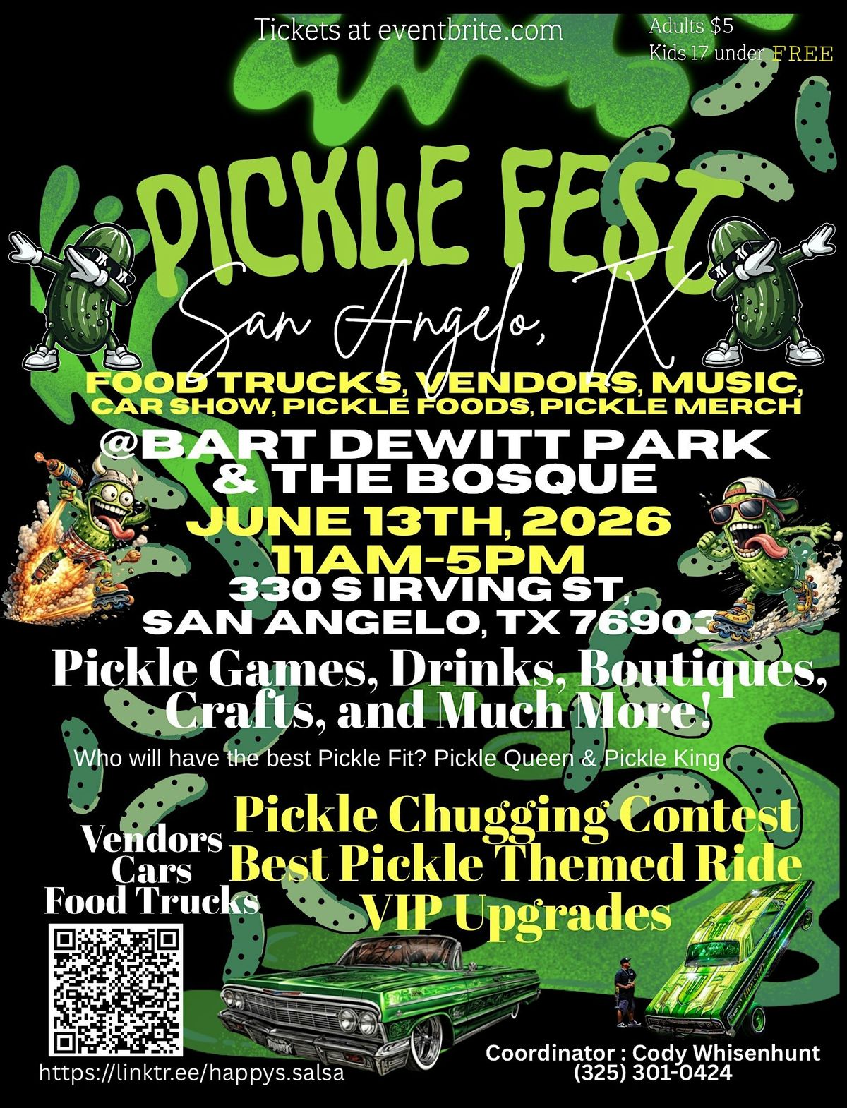 West Texas Pickle Fest hits San Angelo June 13! Pickle games, Car show, food trucks, vendors, contests & family fun at Bart DeWitt Park.