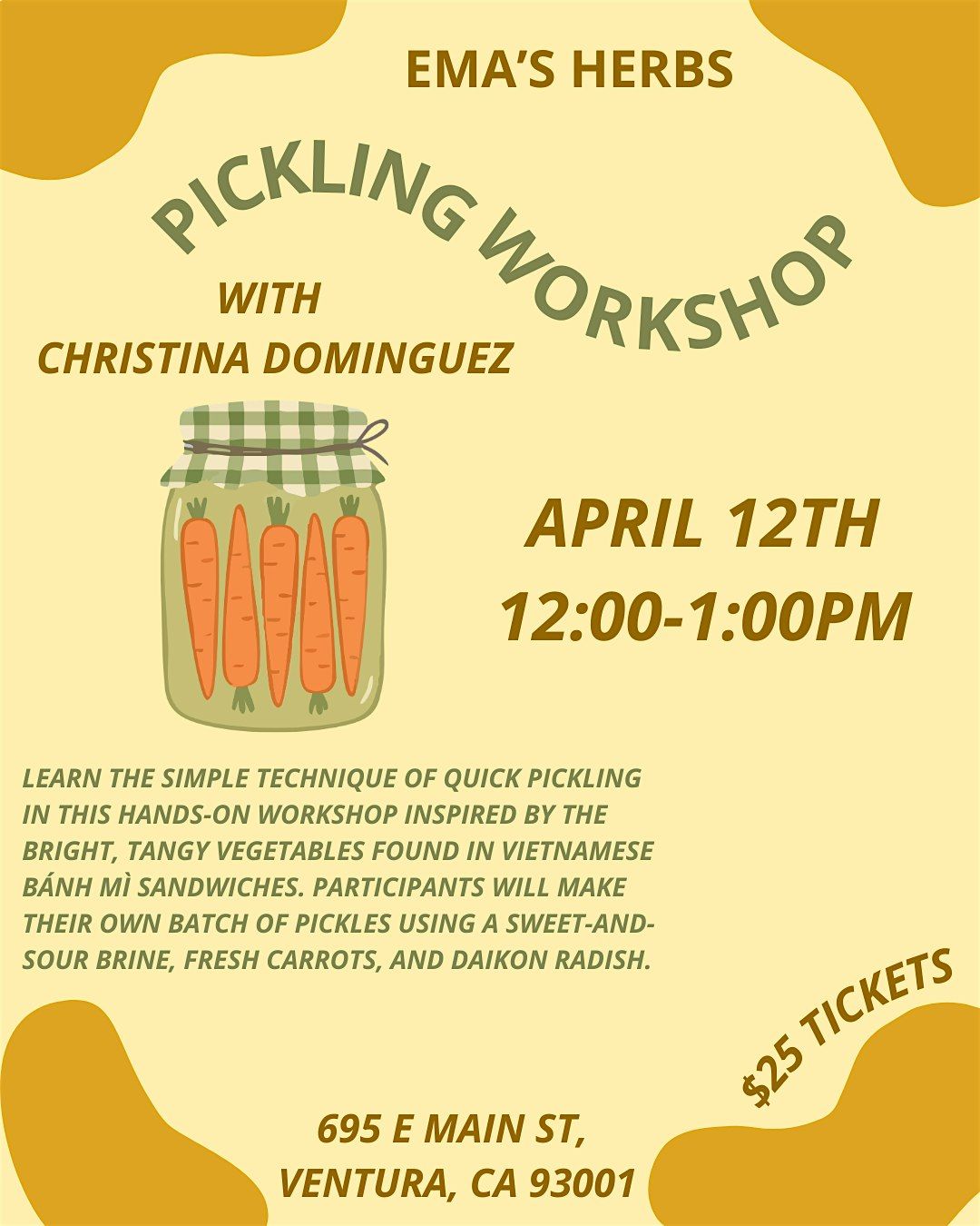 Learn the simple technique of quick pickling in this hands-on workshop inspired by the bright, tangy vegetables found in Vietnamese bánh mì sandwiches. Participants will make their own batch of pickles using a sweet-and-sour brine, fresh carrots, and daikon radish. Along the way, you’ll learn basic pickling techniques, flavor balance, and how to store your quick pickles at home. Each participant will prepare and take home their own small jar of freshly made pickled vegetables—perfect for sandwiches, grain bowls, and more!