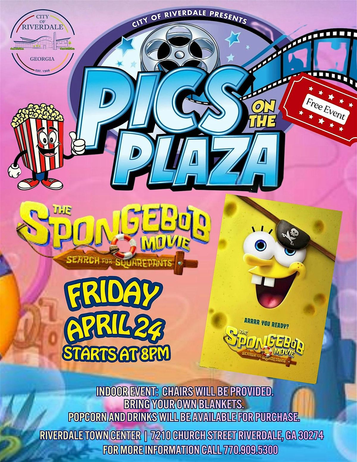 Get ready for an evening of laughter and fun at our Pics on the Plaza indoor movie night! 🌟 Gather your friends and settle in for a screening of The SpongeBob Movie: Search for SquarePants—a perfect pick for all ages.