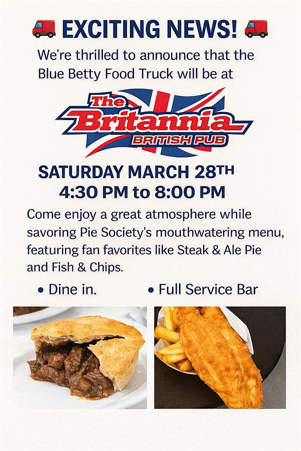 We’re thrilled to announce that the Blue Betty Food Truck will be at The Britannia Pub Saturday March 28th, 2026 from 4:30 PM to 8:00 PM!
