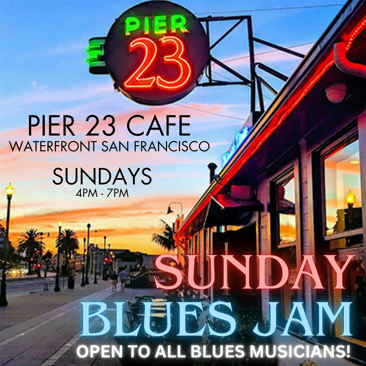 Get ready to kick back and soak up some soulful vibes at the Pier 23 Cafe Sunday Blues Jam! This in-person jam is all about great music, good company, and those chill Sunday vibes. Whether you’re a blues lover or just looking for a cool way to spend your afternoon, swing by and enjoy some live jams, tasty drinks, and a relaxed atmosphere. Bring your friends, your talent, or just your love for the blues — everyone’s welcome!