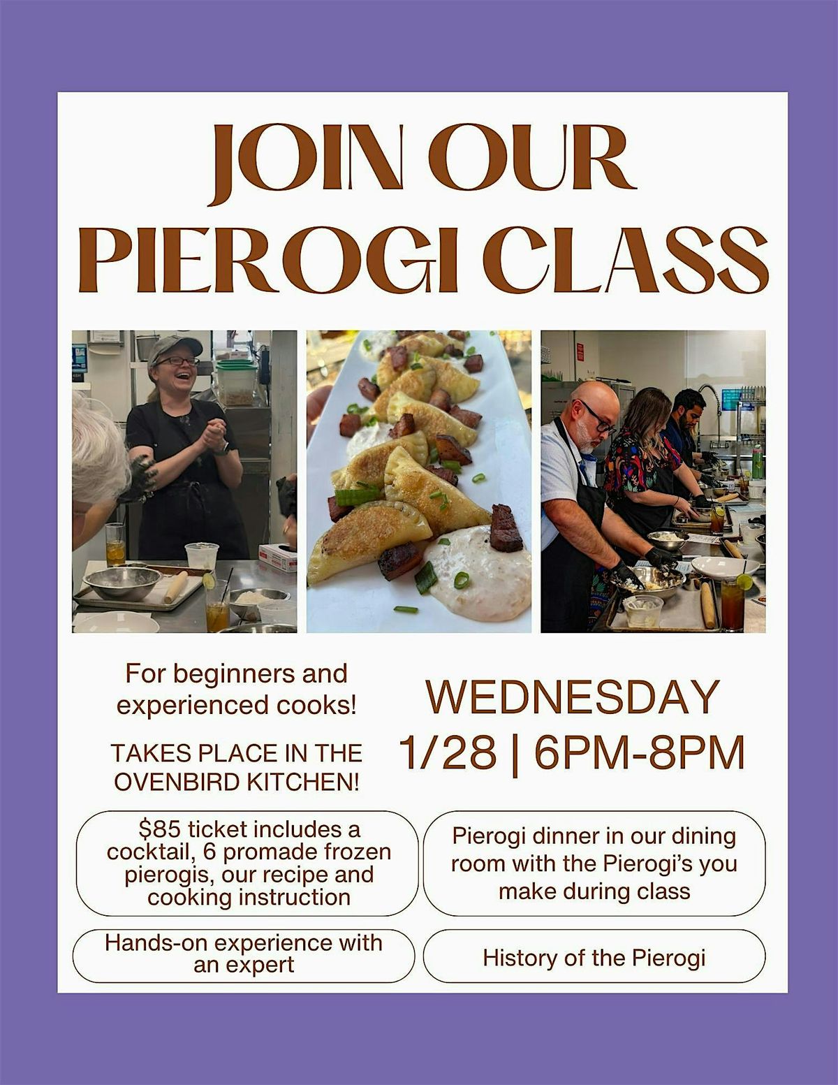 Join us on January 28th starting at 6pm for a fun evening of Pierogis! Chef Sarah will take us through the history of Pierogis and how to make the dough then shape them! At the end of the class we will be eating the Pierogis you made in our dining room along with a special soup. Tickets are $85 each, signing up will be a $10 deposit on Eventbrite. Payment for the rest of the ticket cost and any drink add on will be settled at the end of the event! We hope to see you there!