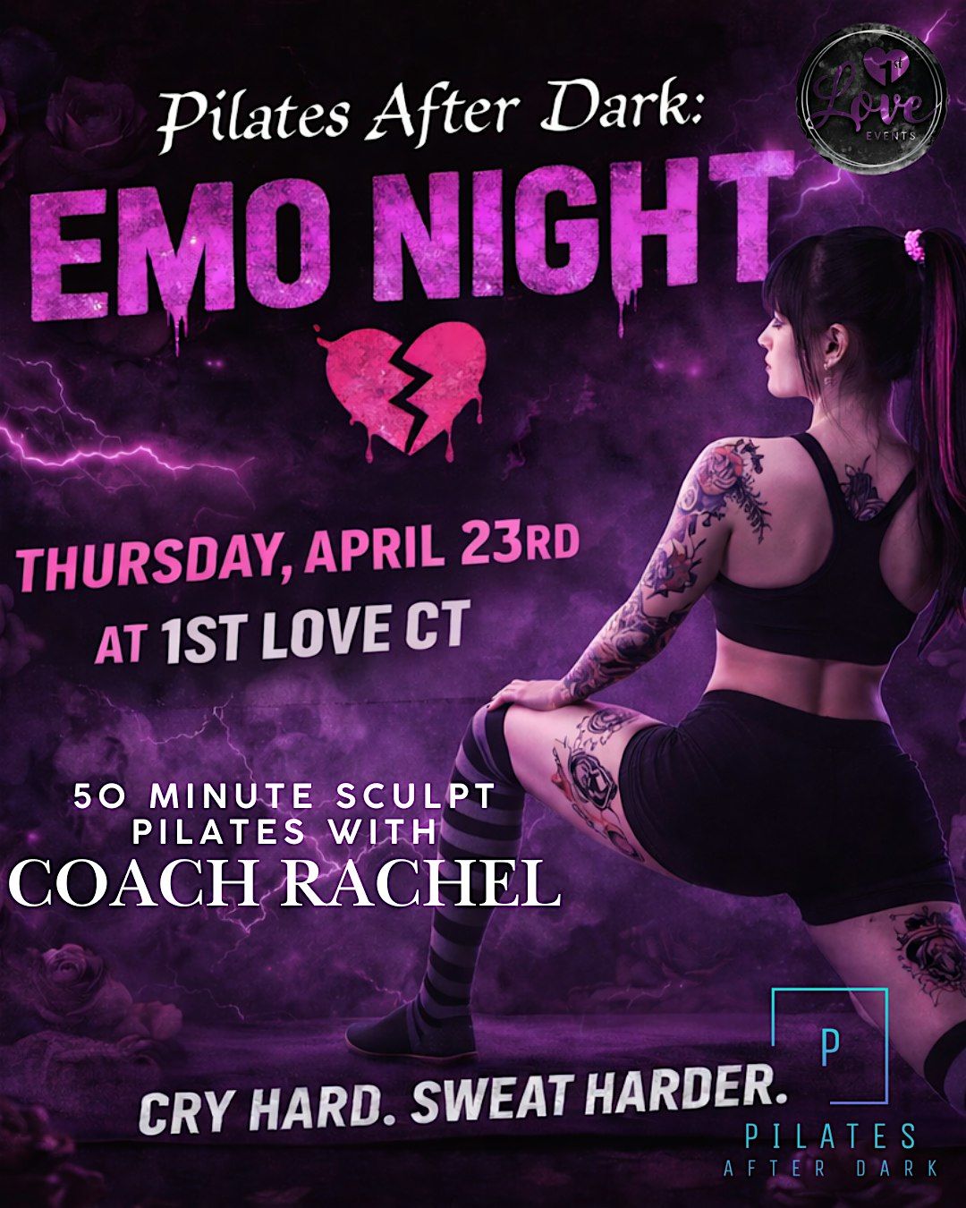 Join us for a special Pilates After Dark: Emo Night Edition with Coach Rachel at 1st Love CT in Newington 🖤